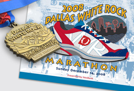Art for the Dallas White Rock Marathon including shirts, medals, posters and other merchandise.
