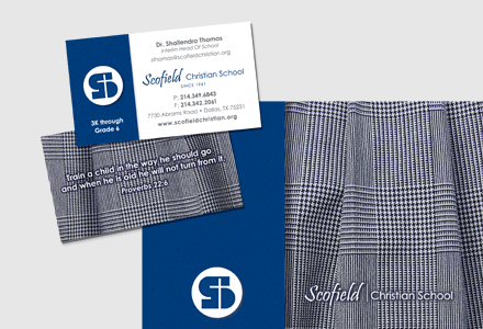 Business cards and pocket folder for Scofield Christian School